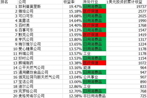 很顯著可以看出,通過50多年,最掙錢的職業(yè)十分會集,主要是日用消費品職業(yè)和醫(yī)療保健職業(yè),壟斷了長時刻牛股的絕大多數(shù)。排行首位的是出產(chǎn)聞名卷煙品牌萬寶路的菲利普莫里斯公司,假如在1957年出資一萬元,到今天會變?yōu)?.97億元!適當(dāng)?shù)捏@人。別的的長時刻大牛股也是咱們耳熟能詳?shù)钠綍r消費品和醫(yī)藥生物公司。